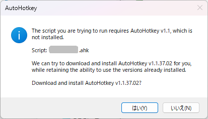 AutoHotkey ver2 (今後は ver2.0)の環境下で,ver1 (今後は ver1.1)の環境でのみ起動可能なスクリプトを実行しようとすると,AutoHotkey 側で以下の画面を表示し,ver1.1 のインストールを促します.