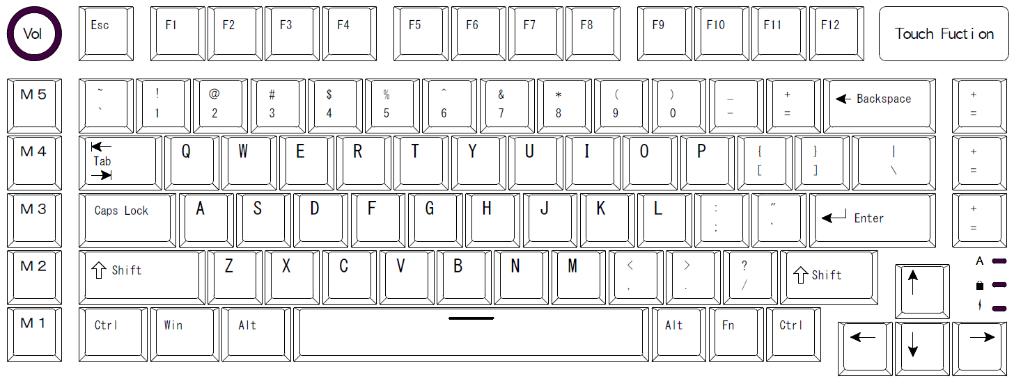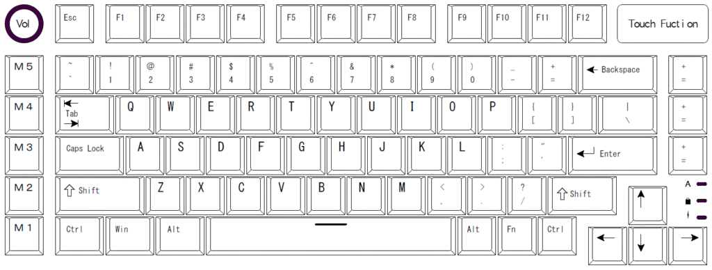 キーボードのレイアウトは以下の通りです.75%キーボードなのでテンキーが無く矢印キーが Enter キーの下にありますが,1/4 u 1分だけ隙間を空けてくれているので,一般的な75%キーに比べて押し間違いが少なくなるレイアウトになっています.