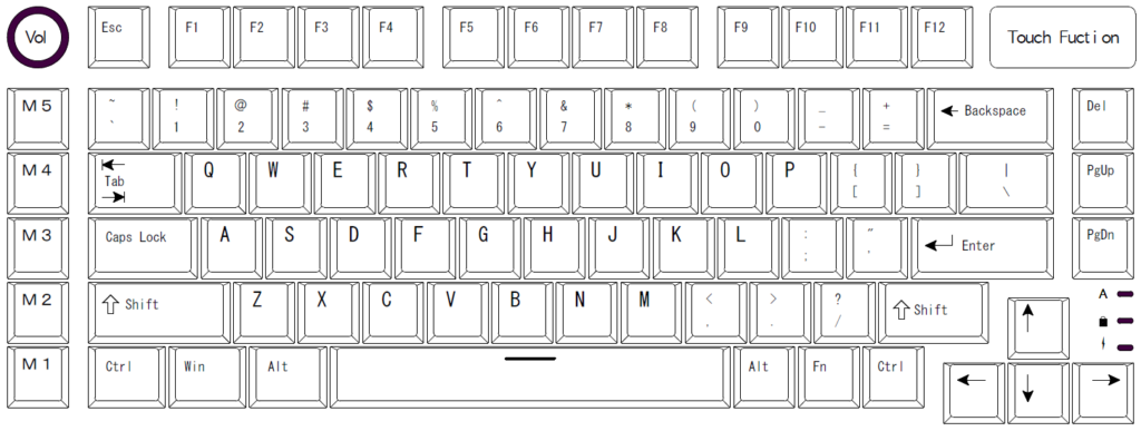 キーボードのレイアウトは以下の通りです.75%キーボードなのでテンキーが無く矢印キーが Enter キーの下にありますが,1/4 u 1分だけ隙間を空けてくれている2ので,一般的な75%キーに比べて押し間違いが少なくなるレイアウトになっています.