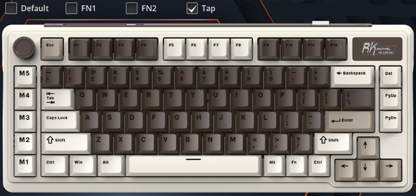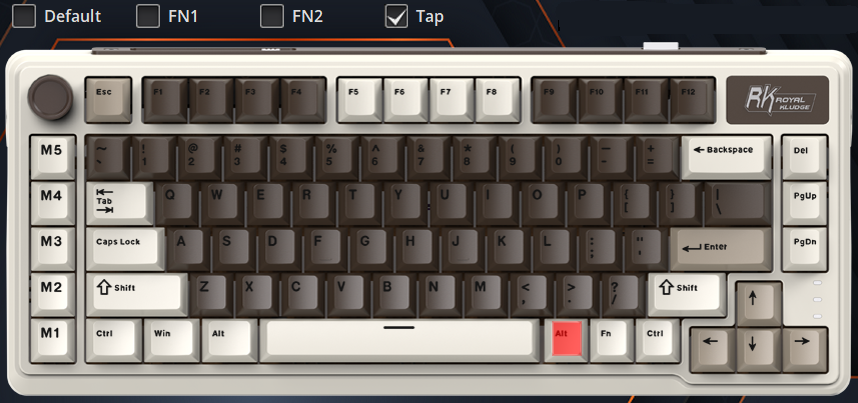 意外に利用価値の高い機能としては,右上の RK ROYAL KLUDGE と書かれた Touch Function です.タッチセンサーになっていて,これに触れる事で予め設定しておいたアクションを実行できます.デフォルトでは,Royal Kludge の RK Keyboard Web アプリの画面が開きます.