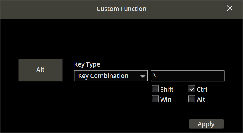 - Key Type を [Key Combination] ,右に[Alt] + [`] を入力して[Apply]